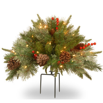 Create an accountThis 18” artificial cedar plant brings classic holiday spirit to your yard or garden. It’s made of green plastic and features 167 full, lush branches trimmed with red berries and pine cones. This piece includes 35 warm white LED lights, which are battery operated by an integrated 6 hours on/18 hours off timer. This display’s black metal tripod base features pointed legs, so it’s easy to integrate into your winter landscaping, creating a merry, bright seasonal display.