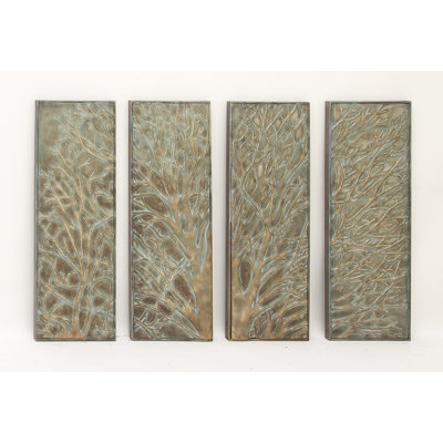 Create an accountThis 4-piece wall decor set is bound to look just right on any of your walls, from the living room to the bedroom. Each piece is made from distressed iron wood, and they feature a rectangular silhouette with branches, leaves, and a trunk that forms a grand tree design for traditional and vintage-inspired appeal. We love that this set is finished in a lightly distressed copper gold and tarnished green hue, giving you that must-have antiqued look. Plus, it features hardware on the back that allows for easy hanging.