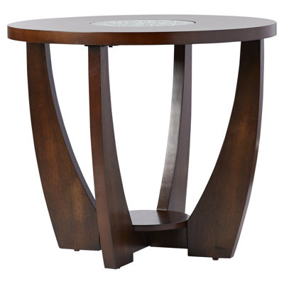 Create an accountThe Red Barrel Studio® Aberfeld End Table brings an aura of dignity through the décor of your home interiors. The shaped surface top of this table is a useful unit to display your expensive and exotic curios, such as an elegant flower vase, a romantic candle stand, or a designer lampshade. The design meted out to the structure of this end table is of a contemporary style suited to balance the appeal of a modern home interior. Manufactured wood and glass are the materials fused in the composition of this classy end table. The four protruding legs visible from the surface elegantly merge into a sled base at the bottom. A glass insert has been fitted into the disc surface top of this end table which replicates it as a smaller version of the sculptural cocktail table. The cherry finish polished upon the birch veneer gives an even tone to the overall look of the table. A suitable place to position this furniture unit is near the window, beside your sofa set, or adjoining your master bed. This Aberfeld End Table from Red Barrel Studio® will add a glow of antiquity to the décor scheme of your residence. The material used in the construction of this end table ensures long-lasting durability and sturdiness.