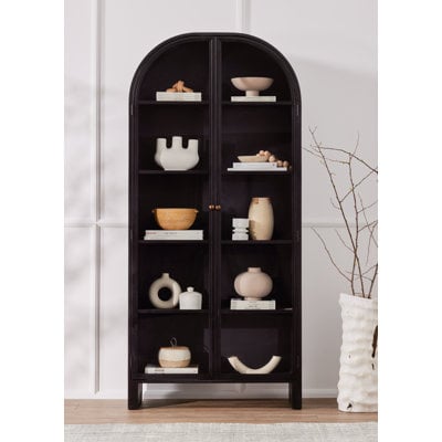 Create an accountThis bookcase stands tall with its arched design and sleek glass doors, creating a sophisticated focal point in any room. Crafted with an iron frame and five wooden shelves, it provides generous space for books, decor, and more. Each sturdy shelf holds over 80 lbs., perfect for showcasing your prized possessions. The glass doors keep your items safe and dust-free, while the finished back allows for flexible placement. Bonus: Tip-over restraint hardware is included for peace of mind.