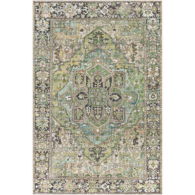 Create an accountThis Oriental rug features an intricate central medallion and dynamic floral motifs all over for a boho look that we love. The pattern comes in distinctive ivory, green, and black tones with a slightly worn appearance. Machine-woven from stain-resistant polyester, this indoor area rug's 0.28" pile height gives you ample cushioning underfoot in living rooms, entryways, or dining areas. Even with a canvas backing, we think rolling it out over a rug pad is a good idea.