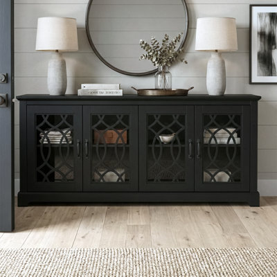 Create an accountBring timeless elegance to your living space with this Traditional TV Stand. Available in White, Black, Grey, Beige and Brown finishes, this versatile entertainment center features four decorative cutout doors that keep your essentials dust-free while allowing a subtle, see-through display —ideal for maintaining TV sensor remote access without opening the doors. Inside, four adjustable shelves offer flexible storage for décor, books, and media components, while cable management hole keep wires neatly organized. The spacious tabletop supports TVs up to 75 inches, and a QR video assembly guide ensures clear, step-by-step instruction for confident setup of this TV media console.