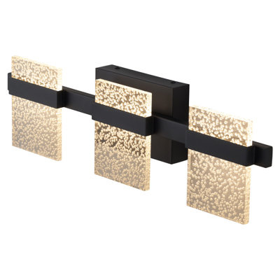 Create an accountThis contemporary 3-light vanity fixture brings a modern touch of illumination to your bathroom. Made from iron, it features a rectangular backplate and a pipe-inspired arm with a metallic finish. Three clean-lined panels of plastic are seeded with small bubbles, with included 15W integrated LED lights shining through the clear material to create a dynamic, glowing effect. Our favorite? This light fixture is rated safe for use in damp locations, so it holds up against indirect contact with moisture.