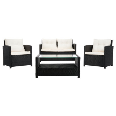 Create an accountCreate an instant gathering spot on your porch or patio with this classic 4-piece seating group. This set includes one loveseat, two armchairs, and one coffee table. All pieces are made of steel and resin rattan, which is resistant to water and corrosion. The loveseat and chairs feature square backs and gently curved arms. Their seat and back cushions are filled with foam and covered in water-resistant zippered covers, so they’re easy to remove for cleaning. Button tufting elevates the look. The 35.88” wide and 21.84” deep coffee table has a glass top and a lower shelf, so you have plenty of room to eat, entertain, and display your favorite decorative items.