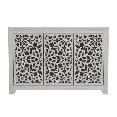 Create an accountThis sideboard helps keep your living room or dining area organized while showcasing a boldly traditional look. It's clean-lined and crafted from engineered wood with a distressed finish that highlights natural grain variation for a hint of rustic charm. Our favorite part is the trio of dynamic door fronts with a floral cutout pattern. Open all three to reveal lots of interior storage for everything from dinnerware and place settings to media and entertainment essentials. A wall anchor is also included with this server for extra safety and stability.