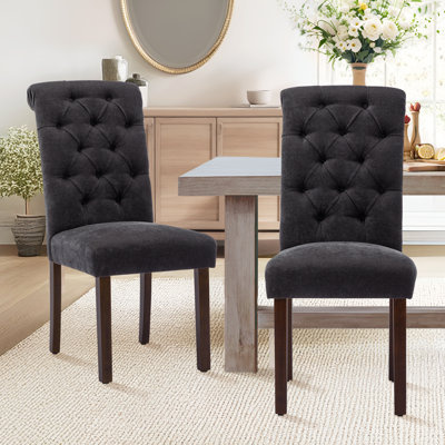 Create an accountArriving as a 2-piece set, this dining chair enhances your eating space with its bold, Parsons-inspired silhouette. It's crafted from a blend of solid and engineered wood, and it features a warm, walnut finish for a classic look. The high rolled backs and square seats are upholstered in linen-look fabric and padded with foam for just-right support. Button-tufted details add a hint of sophistication, while adjustable plastic glides protect your floors from scratches. Each chair in this set can accommodate up to 250 lbs.