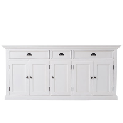 Create an accountThis credenza is ideal for your dining room or anywhere you need some extra storage and a boost of coastal farmhouse design. It's made from solid and engineered wood in a crisp white finish for a coastal aesthetic. Crown molding and frame molding on the doors and drawers give this credenza a farmhouse flair. The three drawers have antique brass-finished cup pulls and offer storage space for your smaller serveware essentials. Plus, the two double-door cabinets and center cabinets offer extra out-of-sight storage. But the best part? This small sideboard arrives fully assembled.