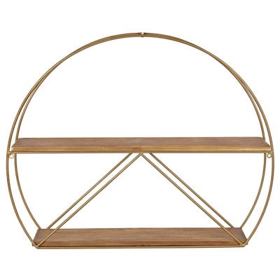 Create an accountBrighten up your home décor with a touch of mid-century modern glam with this product. The sturdy metal frame has a metallic gold finish, while the beautiful, smooth shelving includes a refined walnut finish. It is a two-in-one piece with dynamic wall décor and convenient display and storage. The two walnut-finished shelves have graduated lengths to fit within the trendy geometric shape, with the middle shelf measuring 25.25" and the floor shelf at 20.6". Utilize this mid-century-inspired shelf as a place to display photos, novelties, or even small plants. If you're looking to add a touch of glam to your kitchen or bathroom, this shelf also makes a creative, eye-catching spice rack or medicine cabinet. Display it standing on the ground or mount it over a console table or desk with metal eyelet hangers and the included hardware. This product makes a unique, beautiful statement in your living room, bedroom, kitchen, or bathroom.