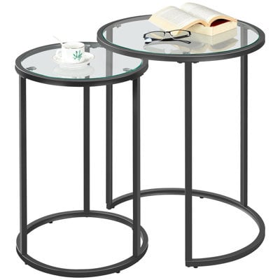 Create an accountThis chic nesting table set showcases tempered glass tops and sleek metal frames in a modern finish. The smaller table tucks neatly beneath the larger, offering both form and flexibility. An accent piece ideal for stylishly displaying decor in compact or open-plan interiors.