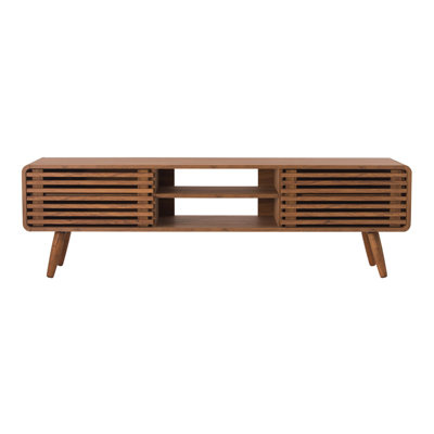Create an accountElevate your living space with this mid‑century modern TV stand, built from engineered wood and supported by solid wood legs for added stability and a premium touch. A slatted front adds visual texture, while sliding doors open to reveal enclosed storage that keeps clutter out of sight. The spacious top holds TVs up to 65", and open center shelving offers easy access to media players, speakers, or gaming consoles. Clean lines and a low‑profile silhouette blend easily into a range of interiors. We love that it balances everyday function with streamlined style.