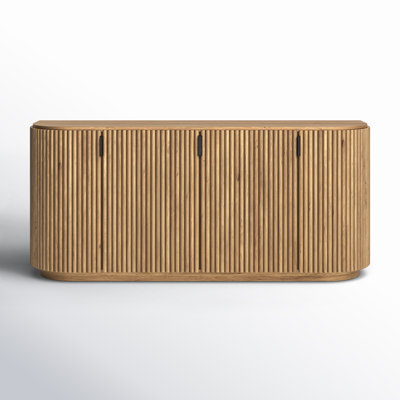 Create an accountThis sideboard brings both style and functionality to your dining room or living space. Crafted from kiln-dried solid Mango wood, it showcases a natural wood grain color variation that adds warmth and character. The ribbed detailing on the four doors, paired with gold-finished hardware, offers a refined touch to its rustic vibe. Inside, you'll find six shelves that provide ample storage for your dinnerware, linens, or other essentials. The magnetic catch ensures the doors stay securely closed. For added stability, consider using a wall anchor (sold separately).
