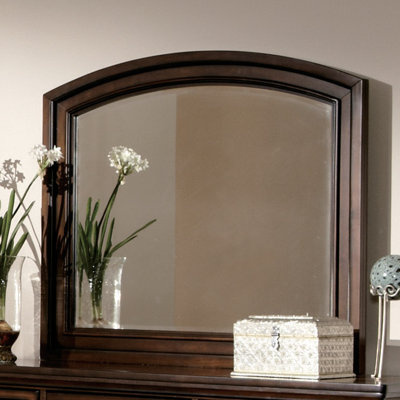 Create an accountBring a sense of warmth and elegance to your transitional bedroom with this beautifully framed mirror, finished in a rich brown cherry over birch veneer and select hardwoods. Soft curves and classic lines create a welcoming, timeless look that complements your personal style.