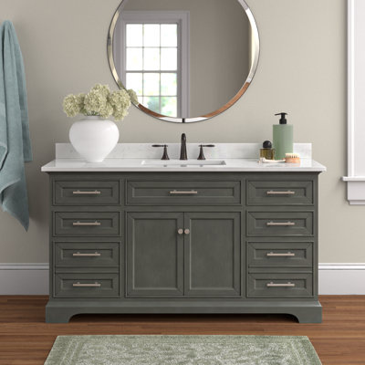 Create an accountThis single-bathroom vanity set features clean lines and plenty of drawer space for all your makeup, toiletries, and cleaning supplies. Its wide 60" design is made from solid and manufactured wood in a neutral finish, and its surface is crafted from engineered stone in a Carrara white finish that complements your contemporary decor. The included undermount sink is made from ceramic, and it boasts a rectangular silhouette. Eight indented drawer fronts come with handles and they open up to reveal space for washcloths, toothpaste, and hair ties. And the two matching doors with rounded knobs hide extra shelf space for hairdryers and bath towels. Plus, this bathroom vanity comes with a backsplash to help protect your walls.
