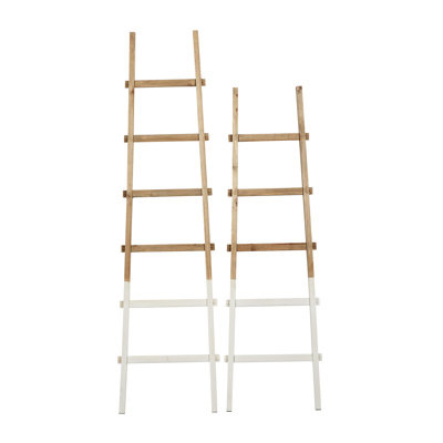 Create an accountLightweight and easy to move around, use this ladder to drape clothing in your bedroom and hang a few lightweight items. Maximize your wall space with is ladder stand for additional storage in your home. Style your modern home by organizing bathroom towels or bedroom blankets with this brown set of 2 blanket ladders. Designed with felt or rubber stoppers at the base that prevent scratching furniture and table tops, as well as sliding around. This item ships in 1 carton. Suitable for indoor use only. This item ships fully assembled in one piece. Maximum weight limit is 60 lbs. This brown colored wood blanket ladder comes as a set of 2. Wood ladder features 11 shelves. Modern style.