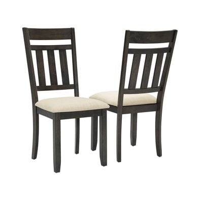 Create an accountThis 2-piece dining chair set brings rustic style and comfort to your kitchen or dining space with a modern farmhouse design. Each chair features a solid wood frame and legs in a slate finish, complemented by an upholstered seat covered in a cream linen fabric. The classic slat back design adds charm and sophistication, while foam fill in the seat provides ample comfort for family gatherings. Plus, this set includes adjustable leg levelers to ensure stability on any floor surface.