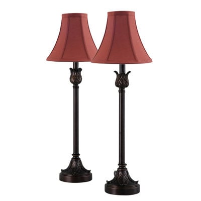 Create an accountA family of lights radiate contemporary style. Featuring a slim metal body in a clean bronze finish, the Bronze Buffet Table Lamp Set 19358-003 readily complements your interior decor. Burgundy fabric bell shades top the lamps, offering a pleasing aesthetic. A 1-way on/off switch on the socket’s body offers convenient and accessible power control. Revamp your bedroom, family room, dining room, or office with this Bronze Buffet Table Lamp Set. Updating the light fixtures in your home is the most effective way to accomplish an alluring, yet simple, DIY remodel. Producing captivating fixtures for nearly five decades, Catalina Lighting extends a 1-year limited warranty against defects in materials and workmanship. LED Bulb NOT Included.