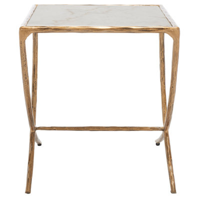 Create an accountClean lines and mixed materials combine to form this sophisticated end table, the perfect platform for an accent lamp or coasters. It has an iron frame and curved legs that come in a heavily distressed brass finish, so it's easy to work into glam and mod aesthetics. A contrasting square table top is made from white genuine marble with gray veining, creating a classic surface. The horizontal bar underneath provides ample support and on-trend style for an airier vibe.