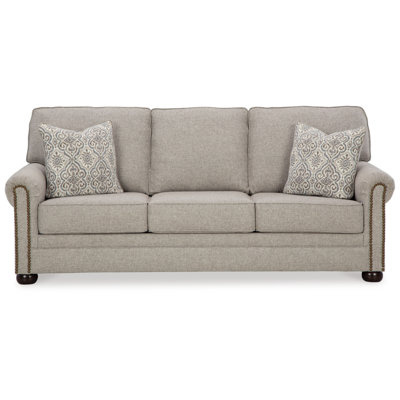Create an accountInspired by the past but rooted firmly in the present, this sofa complements your transitional seating area. Its versatile upholstery is delightfully detailed for a subtle herringbone effect. Designer touches like decorative nailhead trim and bun legs add traditional character. With this sofa's reliable style and comfort, all you need to do is sit back and relax.