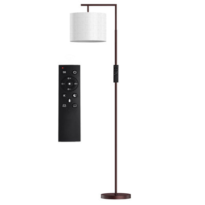 Create an accountClean lines and modern convenience make this floor lamp a dynamic addition to any room in your home. Crafted from iron with a sleek finish, it has a circular base and a slender pole that turns at a right angle up top. Attached to the end is the fixture, which includes a dimmable LED surrounded by a white linen drum shade. A remote control and foot switch come with this lamp, so you can turn the light on or off, as well as alter color temperature and other elements to suit your space's overall ambiance.