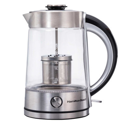 Create an accountIf you prefer a pot of tea over just one cup, this Hamilton Beach glass kettle is ideal. A removable, stainless-steel infuser lets you brew tea directly into the kettle. A soft blue light illuminates the glass kettle to signal to boil, and cord-free serving makes it perfect for passing around. Integrated safety features prevent boil-dry. Steep your favorite teas with a built-in infuser- Whether it’s green or oolong, brew your favorite tea directly in the kettle. Simply push the infuser down into the kettle once boiling stops. Stainless steel Infuser- Infuser removes for easy access and cleaning. It can hold loose-leaf tea and bagged tea. Cord-free serving- Bring the kettle from its base to the tabletop for easy serving when hot water is needed. Speedy results meet peace of mind - Boil up to 1.7 liters of water quicker than a microwave can do the job. Built-in safety features like automatic shut-off and boil-dry protection make it safer than boiling a kettle on the stovetop.