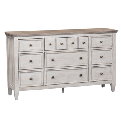 Create an accountThis 9-drawer dresser provides an expansive storage solution for bedrooms or guest spaces while adding a clean, structured look to your layout. Its frame features a mix of solid and engineered wood, showcasing a lightly distressed surface that gives it a timeworn feel. The top row includes five smaller drawers for organizing accessories, while four larger drawers below accommodate bulkier clothing items. Classic metal knobs and framed drawer fronts offer a subtle traditional influence. We also love that the wide top surface serves as a spacious display area for lamps and decor. Hand-curated by Kelly Clarkson.
