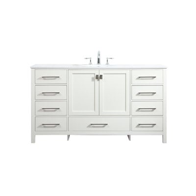 Create an accountThis single vanity set freshens up the look of your main bathroom or guest bath. The clean-lined frame includes an engineered marble countertop with a crisp white finish that accommodates soap dispensers and toothbrush holders, and it features a porcelain undermount sink. This freestanding vanity showcases two cabinet doors and nine soft-close drawers that open to reveal space for cleaning supplies, towels, and other toiletries. We love how the brushed nickel drawer pulls complement its neutral hue. Plus, this 60" wide vanity set arrives fully assembled, so you don't have to break out your toolbelt.