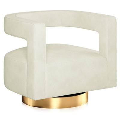 Create an accountThis swivel barrel armchair invites you to sit back and relax in any direction, thanks to its 360° gold-finished metal base. Its modern geometric design blends futuristic elements with luxe minimalism, making it a stylish addition to your living room or reading nook. This chair is crafted from a solid wood frame, and it features a curved, open back that provides ergonomic support while you sit. Upholstered in luxurious velvet, it offers a comfortable and textured feel. With the ability to support up to 300 lbs, this swivel barrel chair is both functional and elegant, just right for enhancing your contemporary decor.