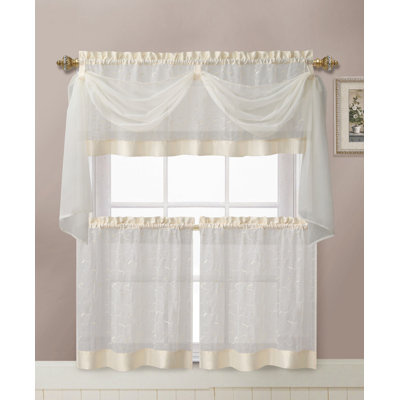 Create an accountBring traditional elegance to your kitchen window with this four-piece curtain set! Crafted of 100% polyester, two curtain tiers (36" H x 60" W overall) and one valance (18" H x 60" W) showcase delicate leaf and vine work embroidery over a solid-hued semi-sheer backdrop. Each piece features a rod pocket header and wide bottom hem in a matching sateen finish, while a decorative valance scarf lends an added dash of elegance. Designed for effortless upkeep, this set is machine washable and iron-safe.