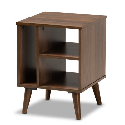 Create an accountA compact retro design makes the Kennell end table a charming addition to any living space. Constructed from wood, the Kennell features a walnut brown finish that complements any color palette. The tabletop features space to place a lamp, while three lower shelves provide room to display books and decor. Angled, tapered legs add a playful mid-century look. The Kennell end table is made in Malaysia and requires assembly.
