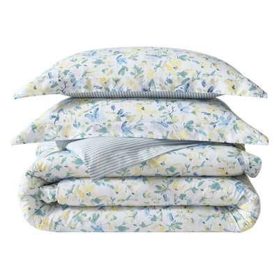 Create an accountNo matter the season, you can always wake up to Spring with this Nora Reversible Comforter Set. A garden fresh palette of cornflower blues and sunny yellow on a crisp white cotton ground reverses to a classic blue and white ticking stripe that also appears on the European shams and a coordinating shirred accent pillow. An additional accent pillow made of white cotton eyelet embroidery adds a signature heirloom touch to this updated cottage style.