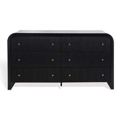Create an accountThis double dresser is your new go-to for style and storage, seamlessly blending form and function. Crafted from solid and engineered wood, it features a sleek horizontal profile with a curved waterfall edge that adds an inviting touch to your bedroom. The ribbed texture on the facade, paired with round gold knobs, brings a modern twist to its timeless design. With six spacious drawers on ball-bearing glides, organizing your clothing and linens has never been easier. Plus, the kiln-dried solid wood construction ensures it stands up to daily use. Add felt pads under items to keep the finish looking fresh.