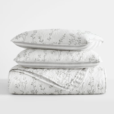Create an accountThis plush quilt set instantly refreshes your bedroom or guest room with a cozy and traditional botanical and striped design. It includes a quilt and shams, and each matching piece showcases simple foliage leaf printed pattern on one side and a nautical/coastal stripe on the reverse in white and light gray for a well-worn look. Shams and quilt are fully reversible. This set is crafted from incredibly soft microfiber, brushed on both sides for the ultimate cozy feel and is machine washable and tumble-dryable when it comes time for a quick cleanup. We also love that the quilt is filled with hypoallergenic polyester fill for plenty of cozy comfort while you sleep.