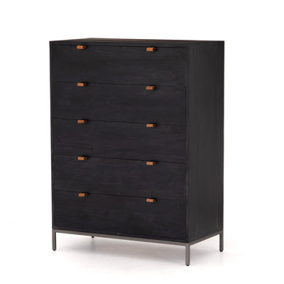 Create an accountThis 5-drawer dresser brings clean lines and a weathered, farmhouse look to your main or guest bedroom. Made from solid poplar wood, it features five spacious drawers that provide ample storage for your clothing, extra linens, and accessories. Each drawer is accented with metal-secured leather pulls in a brass color, adding an unexpected textural element to the design. We love that there's room on the surface for displaying accent pieces and a few framed photos. Plus, the sleek metal base and legs with a gray finish provides the right amount of contrast.