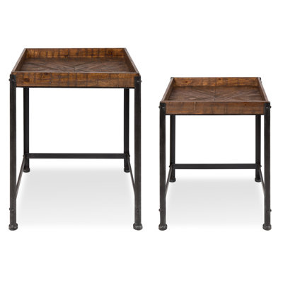 Create an accountThese nesting tables feature tray-style tops and pedestal bases for a compact, industrial-inspired design that works hard in any space. Each tabletop is crafted from solid fir wood with visible knots and a rustic brown finish that adds a salvaged, weathered feel. The black metal base has an open X-frame design and a distressed look that leans into factory-style character. Nest them together when not in use or pull them apart for extra surface space as needed. We also love that their small footprint makes them easy to move and style wherever you need them.