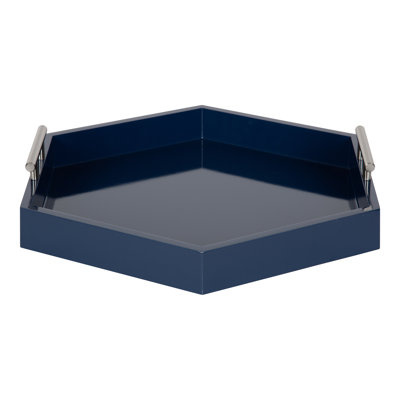 Create an accountBring modern glam style into your home with this hexagon-shaped decorative accent tray with polished metal handles. Place this charming tray on your entrance console table as a trinket tray to hold your keys and mail as you come and go. This hexagon tray is spacious enough to hold documents or file folders on a home office desk. This tray can also be used as a decorative accent on an ottoman to hold your beverages or on your vanity for makeup organization. Constructed of solid MDF with a glossy finish and polished metal handles, this tray is sturdy enough to serve your cocktails. The tray measures 18 inches wide, and 18 inches deep, and stands 3.25 inches high. Bring a chic and glamorous decorative accent into your home with this beautiful modern tray.