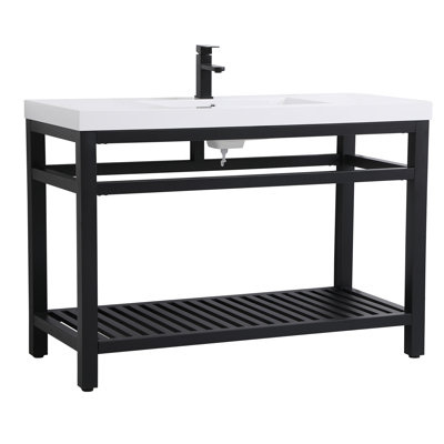 Create an accountIn true minimalistic spirit, this shines with pared-down elegance. Bold clean lines build up the metal vanity, creating a modern simplicity that adds visual liveliness and complements any bathroom or powder room. The bottom shelf lets you put away any extra towels or bathroom essentials, and its shining white under-mount sink creates contrast against the finish. Its bold graphic style will create a contemporary style in your home.