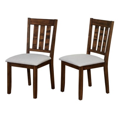 Create an accountThis 2-piece dining chair set brings a farmhouse flair to your dining room or kitchen nook. Crafted from solid wood, each chair features a slat back design that adds rustic charm. The natural wood grain color variation and purposeful distressing lend an authentic, lived-in look that complements your farmhouse aesthetic. Upholstered in a polyester blend, the cushioned seats offer a comfortable spot to enjoy meals with family and friends. With plastic glides on the feet, these chairs help protect your floors from scratches. To keep them looking their best, simply wipe them clean with a damp cloth.