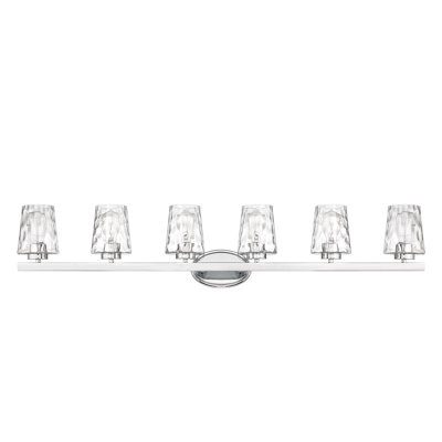 Create an accountThis 6-light vanity fixture dazzles and illuminates larger bathrooms with plenty of modern glam style. Made from steel with a bold metallic finish, it includes an oval backplate and a horizontal bar that attaches to six holders. Waterglass shades feature an eye-catching honeycomb design, reflecting the dimmable glow from six corresponding bulbs (sold separately). We love that you can install this vanity light up or down depending on your preference. And, it's rated for damp locations, making it safe for high-moisture environments.