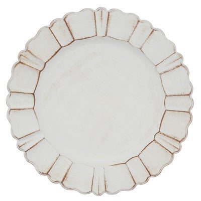 Bring your table décor to the next level with these gorgeous Satter 4 Piece Charger Set. Featuring a light, ivory finish, and shaped with an antiqued scalloped trim, the round charger plates add a graceful note. Pair with elegant dinnerware and cotton or linen table napkins.