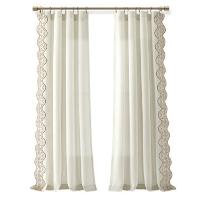 Create an accountDesigned with a beautiful lace trim, this Scalloped Edge Lace Window Curtain Panel also gives you the look of linen, adding texture to your space. This curtain adds charming vintage appeal to your bedroom, living room, or dining room decor. The floral lace trim is just one reason you'll love this window treatment! Not to mention the rustic chic look of the linen-like fabric! Create a dreamy ambiance with this window panel crafted from a linen-like cotton fabric blend composed of 52% Polyester, 37% Cotton, 8% Viscose, and 3% Nylon. The lace detailing along the panel is perfect for a vintage, farmhouse, or French country styled home. This curtain panel measures 52 inches wide by 84 inches long. The 8" lace trim is included in the total width of the panel. Sold as a single panel. This window panel offers seamless installation with its 3" rod pocket, allowing you to easily slide it onto your curtain rod or by using clip rings (not included). Featuring a 2-way rod pocket on both ends of the window panel, this design provides many styling options with a customized look. This window panel is certified, which means the fabric, dyes and all components have been tested in an independent laboratory and certified against a list of more than 350 harmful substances. Caring for the Scalloped Edge Lace Border Curtain is easy, simply machine wash and tumble dry for a quick refresh. Please refer to label for full care instructions.