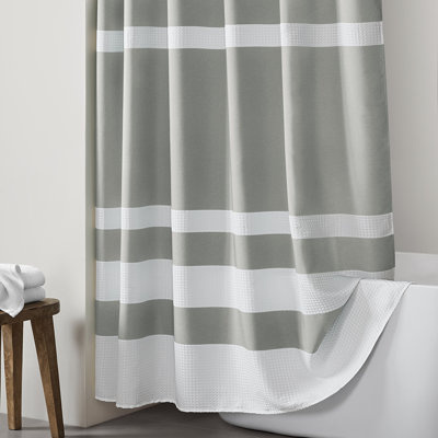 Create an accountUpdate your space with this spa waffle shower curtain with a 3M treatment. Featuring a fresh and updated stripe design, this shower curtain is made of a light heathered colored fabric pieced with a white waffle weave base creating a beautiful texture for the perfect spa touch to your decor. A temporary 3M Scotchgard water-repellent treatment keeps your curtain looking newer, longer, and active for multiple washes. A waterproof liner is not included but still highly recommended to keep this shower curtain in its best condition; hooks and rods are also not included and should be purchased separately. Various colors and sizes are available to fit any bathroom space. The size shown in the image is standard, stripe design may vary per all other sizes. Complete the collection with a coordinated spa waffle bath towel and spa cotton bath rug, available and sold separately.