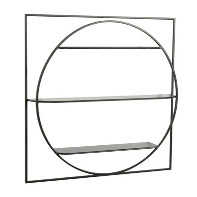 Create an accountThe geometric design features a large square structure holding the main circular section which holds the shelves.. This item ships in 1 carton. Can be hung horizontally using the sawtooths; nails and screws not included. Suitable for indoor use only. This item ships fully assembled in one piece. Maximum weight limit is 15 lbs. This is a single black colored floating shelf. Iron wall shelf features 3 shelves. Contemporary style.