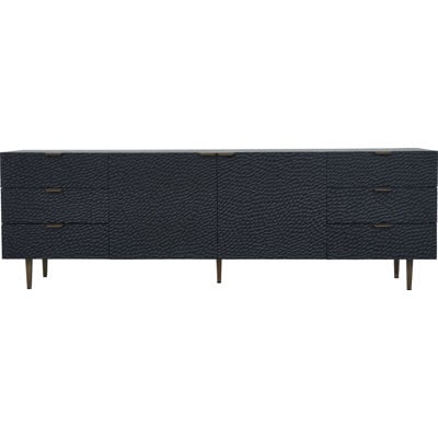 Create an accountThis sideboard brings sculptural texture and warm wood tones to your space. Crafted from solid oak and oak veneer, it features a carved, relief-style façade that plays with light and shadow for added depth. Six roomy drawers offer plenty of storage, accented with gold-finished pulls for a refined touch. Integrated cable management keeps cords out of sight, whether you’re using it in the dining room, office, or media space. Natural wood grain variations make each piece unique, giving it a subtle, one-of-a-kind character.